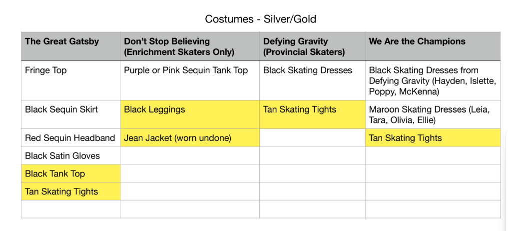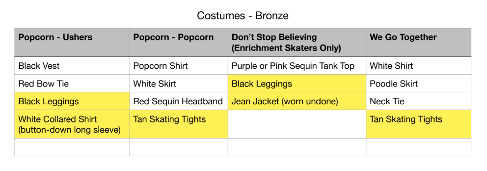 You'll have final rehearsals in the morning on Ice Show Day. Bronze, be at the rink by 10 am. Silver and Gold, be there by 9:15 am. Lunch will be provided before the show.
